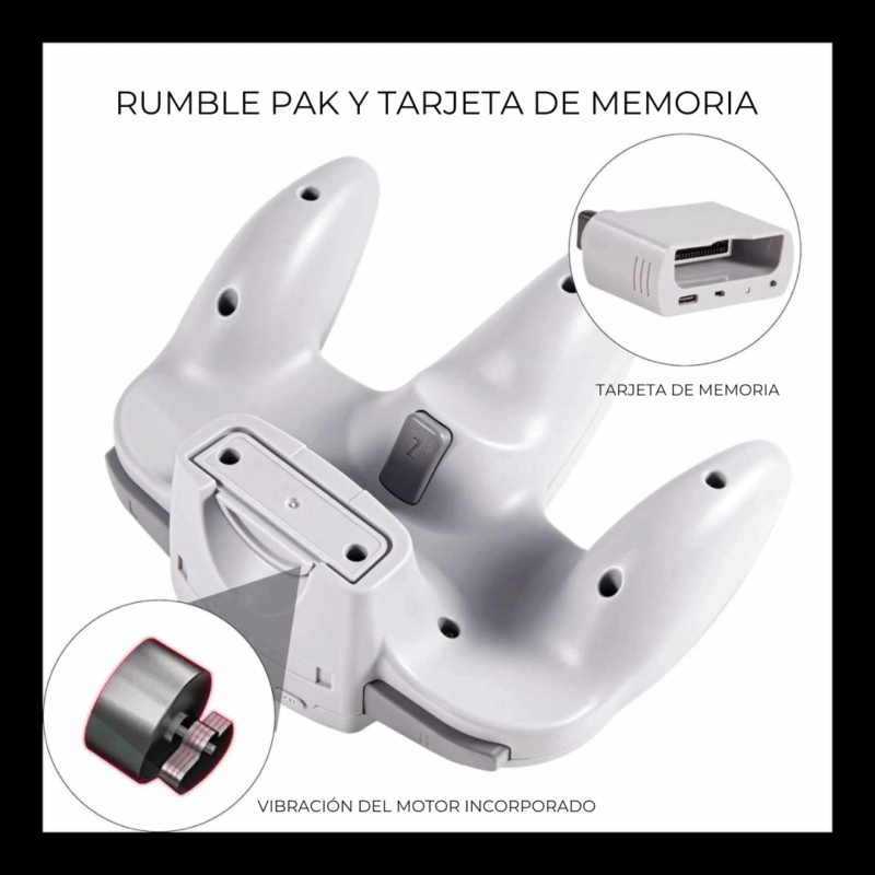 - Compatible con el puerto de expansión inferior, donde se pueden conectar accesorios como el Rumble Pak (vibración) o el Controller Pak (memoria).