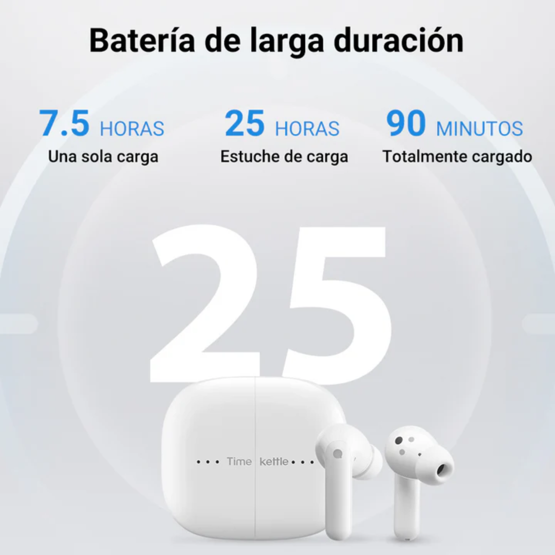 Duración de la batería: Hasta 7.5 horas con una carga completa; hasta 25 horas con el estuche de carga