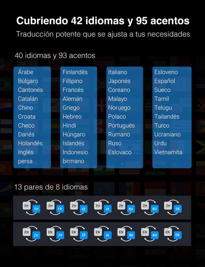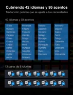 Idioma: Árabe / Búlgaro / Cantonés / Catalán / Chino / Croata / Checo / Danés / Holandés / Inglés / Finés / Filipino / Francés / Alemán / Griego / Hebreo / Hindi / Húngaro / Islandés / Indonesio / Italiano / Japonés / Coreano / Malayo / Noruego / Polaco / Portugués / Rumano / Ruso / Eslovaco / Esloveno / Español / Sueco / Tamil / Telugu / Tailandés / Turco / Ucraniano / Urdu / Vietnamita